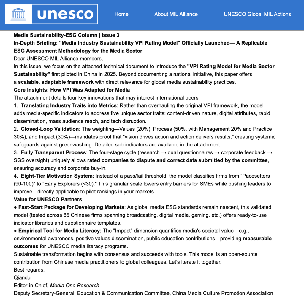 In this issue, we focus on the attached technical document to introduce the “VPI Rating Model for Media Sector Sustainability” first piloted in China in 2025. Beyond documenting a national initiative, this paper offers a scalable, adaptable framework with direct relevance for global media sustainability practices.